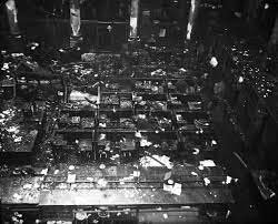 The remains of the Wingfoot struck the bank’s skylight directly and flaming debris fell through to the banking hall below at which point the gasoline tanks attached to its twin engines exploded.. There was a wave of flaming gas radius 50 feet around the workers. Flaming debris rained through the iron and glass roof in the bank building and dropped in the central office space on the main floor. The skylight of the bank, which extended over the greater part of the first floor space was torn out and became a charred mass on the main floor along with telephones, electric lights, adding machines, typewriters, desks, and shares. Girls on the second floor ran screening to the windows several jumped to the street. The injured were taken to Iroquois Hospital at Market and Madison. Others went to St. Lukes and Jefferson hospitals.