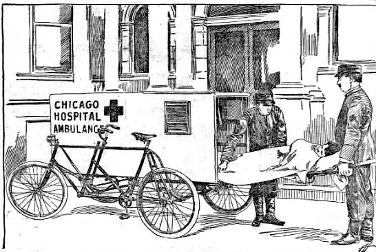 In 1896 Dr. J. T Binkley Junior Invented a cycle ambulance built for the Chicago Hospital at Cottage Grove and 49th St. He felt that his invention would be much faster than the hospital sick wagons quartered in nearby stables. The cycle ambulance could travel over longer distances, claimed a top speed of 17 miles per hour, much faster than a horse ambulance.