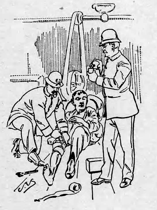 As the Chicago Tribune spent a day observing ambulance work, they interviewed the police officers assigned to the horse-drawn ambulance. There was David Barry, Ryan, Harrington, and Kollock. The majority of ambulance calls back in the day were railroad accidents where someone was losing a leg or arm. Elevator accidents were also very common someone falling down the shaft having a foot caught between the floor in the elevator. In the summertime sunstroke was common so the ambulance carried ice packed rubber skullcaps.