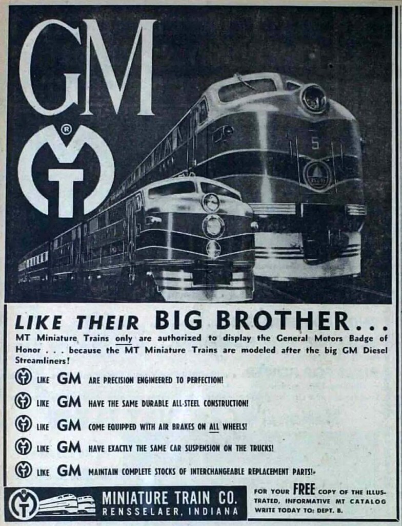 He then began building an outdoor park train, the classy G-16. upon the larger 16” track gauge. He obtained permission from General Motors the use design of the diesel locomotive built by the it’s Electro-Motive Division . In 1946 he introduced his 1/5 scale diesel streamliner design and it became MTC’s most popular model. One of the first G-16’s was tested in Chicago’s Fairyland Park then at 3938 S. Harlem and then sold it to a zoo in Cleveland Ohio. Another first MTC train went to Griffith Park in Los Angeles.