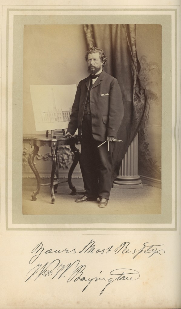 The architect was William W. Boyington born July 22, 1818 in Massachusetts learned his trade as a young man in New York. He trained first as a carpenter, then studied engineering and architecture. He is well known for many buildings such as the Board of trade, Joliet penitentiary, Sherman House, the state capital at Springfield, as well as the national historic landmark Rosehill Cemetery entrance in 1864 and the Chicago Water Tower in 1869.