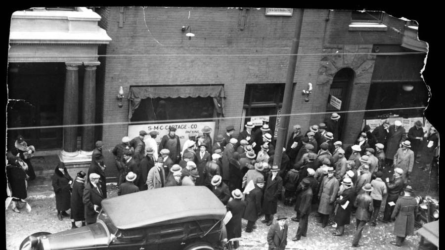 Four men, two dressed in police uniforms arrived in a Cadillac sedan in front of the garage. Two of them opened fire with their “Chicago typewriters”, one containing a 20 round magazine and the other a 50 round drum.