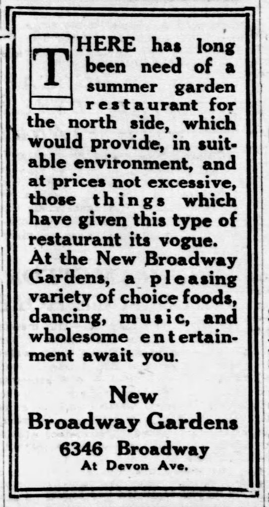 There was the Green Mill Sunken Gardens opened 1914 at4802 North Broadway. Originally called Pop’s Morse Gardens . It later became the Moulin Rouge in 1917 and then Rainbo Garden circa 1921