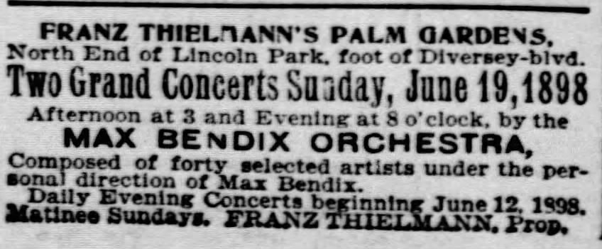 Frank Thielmann’s Palm Gardens originally built as Fischer’ s Gardens opened 1890 on the north end of Lincoln Park at the foot of Diversey Avenue. Circa June 1898. Fire destroyed the garden in February 1900. Nothing was left except the bicycle entrance, a covered gateway, with an estimated loss of $20,000. Several thousand people watched the destruction of the garden.