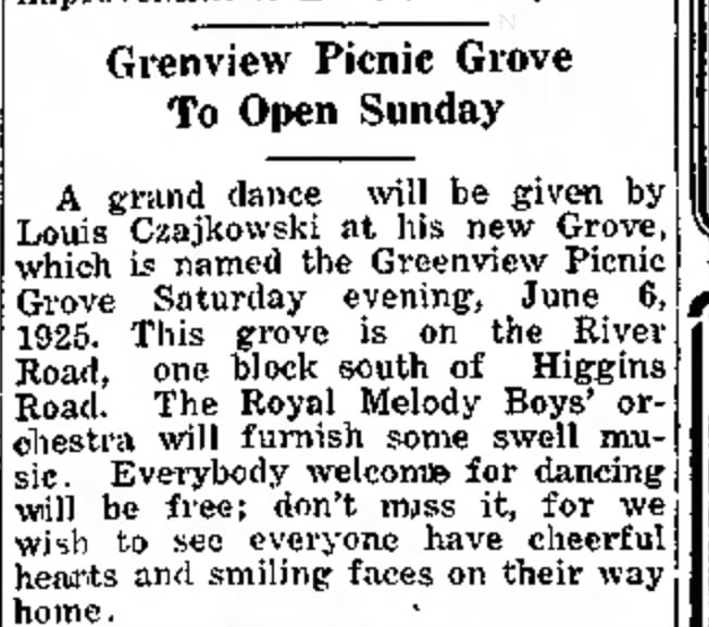 Klehm’s Grove in Niles Center remodeled in 1925 by Charlie landerer , Tessvile inn Lincoln and Touhy dance hall and picnic Grove dancing every Sunday proprietor Tom bodkin