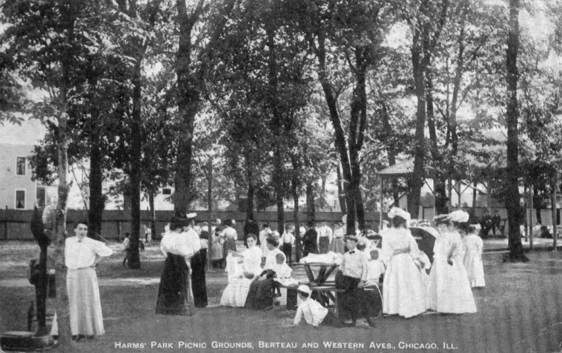 Harms Park Picnic Grove, located on the northeast corner of Western and Berteau Avenues. (4200 north) less than 10 blocks north from and predated Riverview. The land owner Henry Harms 1832-1914, started the park in 1883. He is best known as the founder of the village of Niles Center (Skokie). Harms Road and Harms Woods are also named after him.