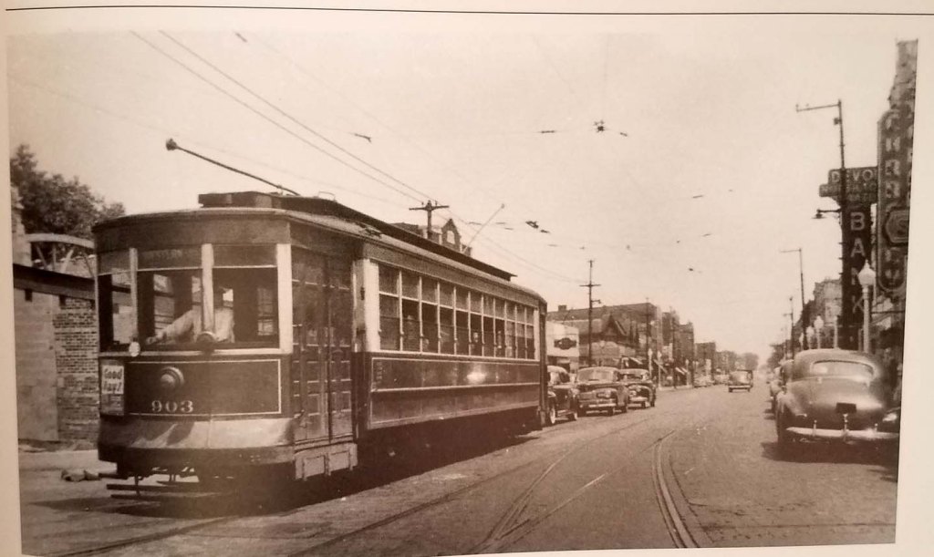 Now we fast-forward to the 1940s and 1950s when we see the old red streetcar just approaching Western Avenue as it just past the Devon bank and the Thillens check-cashing office