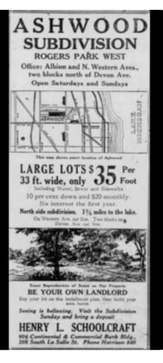 Henry L. Schoolcraft (1868-1936) setup his real estate business on the northeast corner of Devon and Western in 1923.