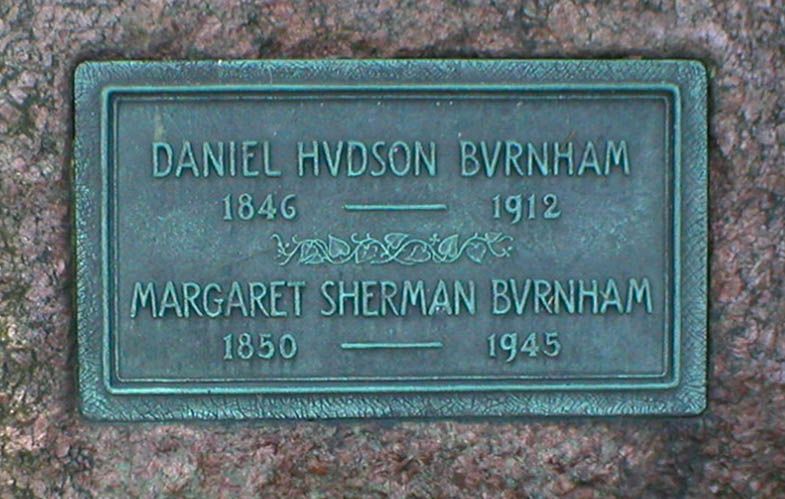 His wife was Margaret Sebring Sherman (1850-1945) , his three sons, Daniel Burnham Jr. (1886-1961) John (1878-1963), Hubert (1882-1968).and two daughters Ethel Burnham Wells (1876-1949) and Margaret Sherman Burnham Kelly (1884-1971). All except Ethel buried in Graceland Cemetery.
