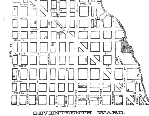 Fernando Jones, ( 1826 – 1911 ) an early resident and founder of a title abstract company, and alderman is quoted to say that burials between 1832 and 1836 were made in a Common Acre on the west side of the North Branch of the Chicago River, south of Indiana Street, (now Grand Avenue).