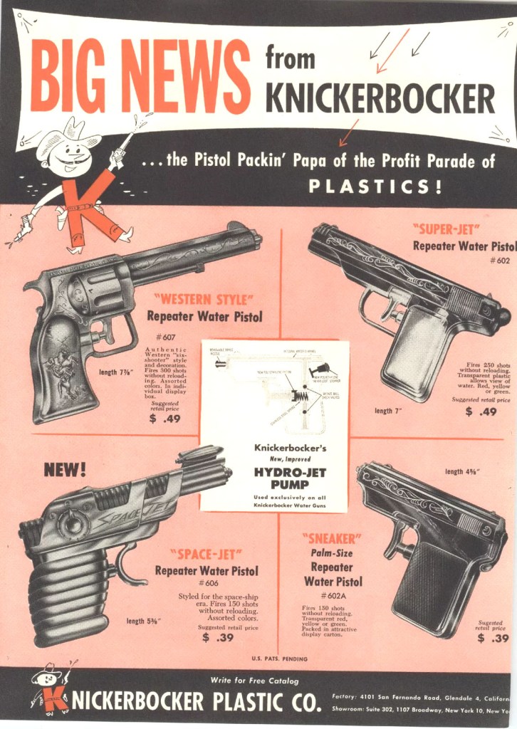 They were bright colors, green, yellow, or orange squirt guns and were readily available at your local dime store or drugstore. In my neighborhood they rarely cost more than 49 cents, more typically 29 cents. . Three of the larger manufacturers were Park plastics, Kilgore and Knickerbocker plastics company. Nowadays they mostly all come from China like everything else.